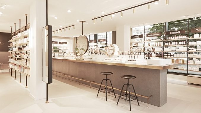 The store’s look reflects the modern orientation of the new beauty concept, taking up the latest standards and combining a minimalist design language with “hygge” elements that ensure a cosy atmosphere. Warm natural materials such as maritime pine meet high-quality brass and soft velvet in elegant grey. The understated interior design promises a sensation of calm and well-being, and the look of the store is soothing to all senses.